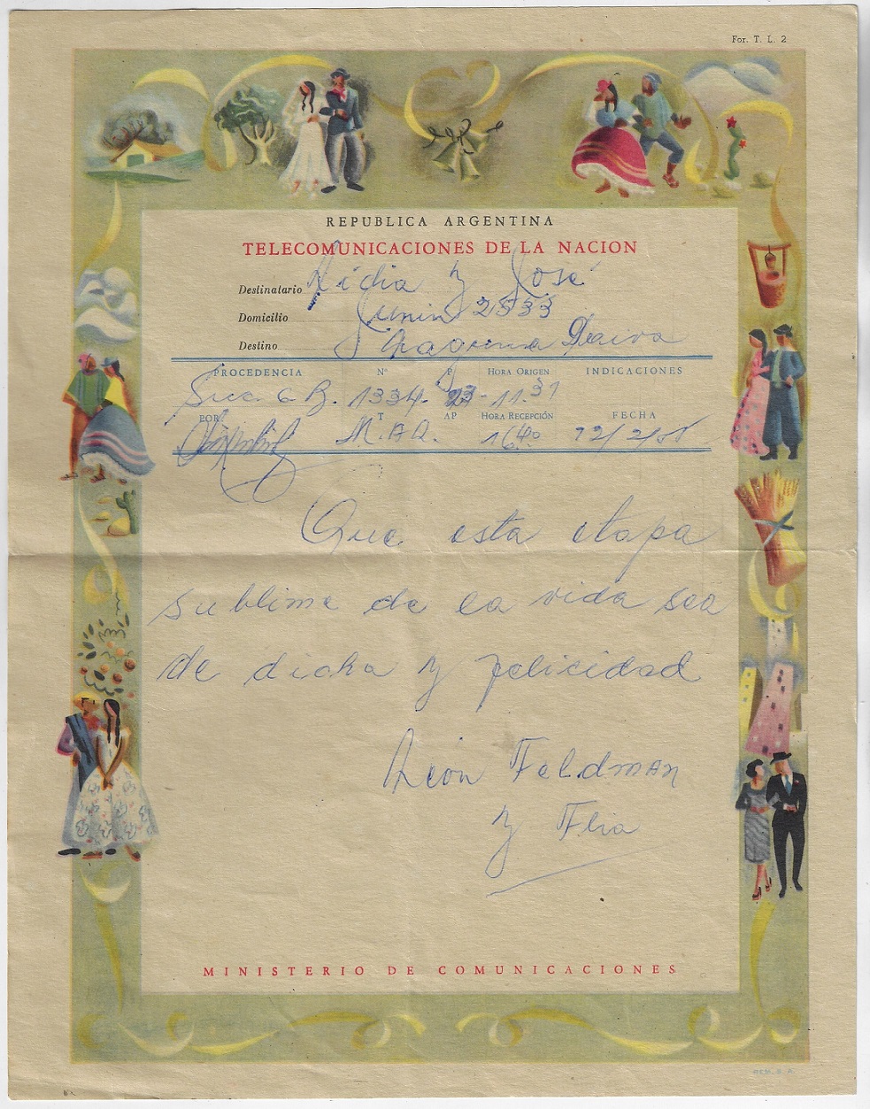 | 84825 | Argentina, 1955, telegrama de luxo do Correio "Casamento", enviado para Laguna Paiva, casais em trajes típicos regionais, cactus, poço, trigo, casa, árvore, sino, tamanho 22,5x29 cm | 100,00 | Foto |