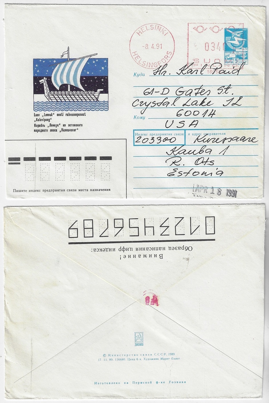 | 84829 | URSS, 1991, Inteiro postal tipo envelope com desenho de barco da Estônia, estilo Viking, circulado com franquia da Finlândia para a Estônia | 15,00 | Foto |