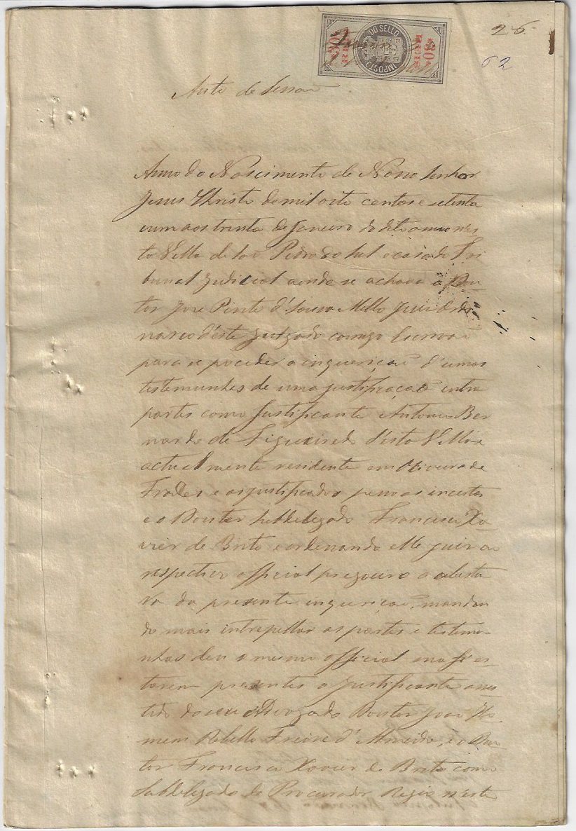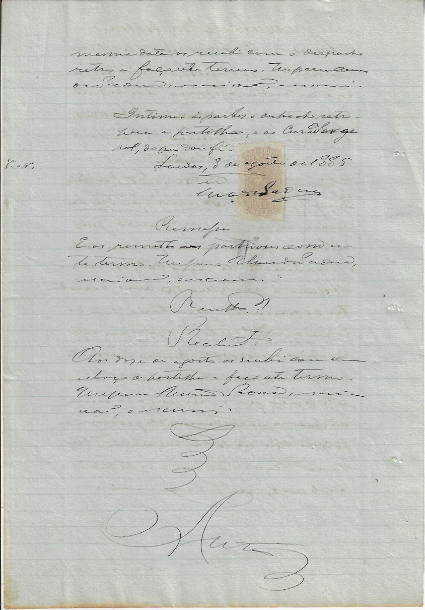 | 84560 | Brasil, 1885, documento com selo fiscal D. Pedro II 200 Réis, papel com filigrana Al Masso, proveniente de Lavras / MG | 20,00 | Foto |
