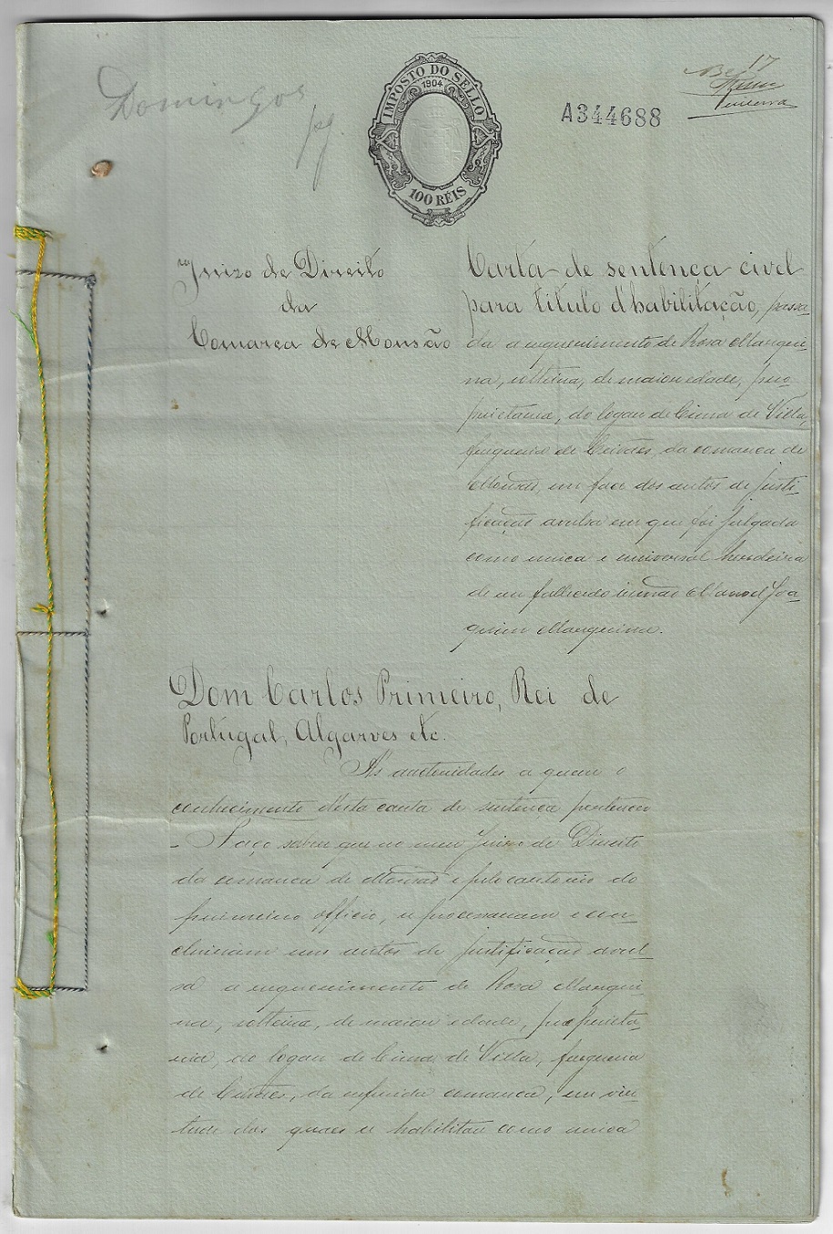 | 1195 | Portugal, 1904, parte de um Processo da Comarca de Mourão com 9 folhas entre as de nº 17 e 25, todas são inteiros fiscais com selo impresso de 100 Réis | 129,00 | Foto |