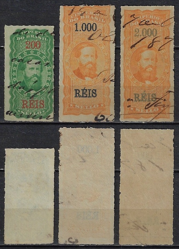 | 985 | Brasil, 1876/1877, selo fiscal D. Pedro II 200 Réis, 1$ e 2$, percê, obliterados a pena | 24,00 | Foto |