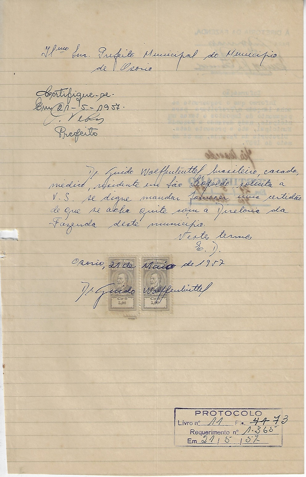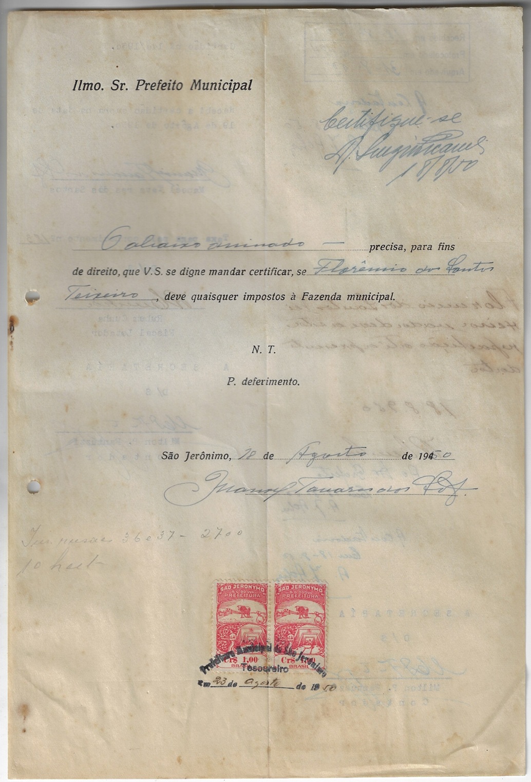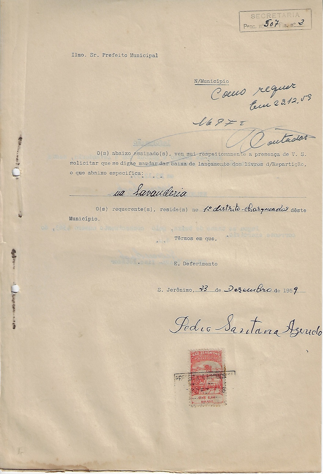 | 917 | Brasil, 1959, solicitação de certidão com selo fiscal do Município de São Jerônimo/RS de Cr$4 | 12,00 | Foto |