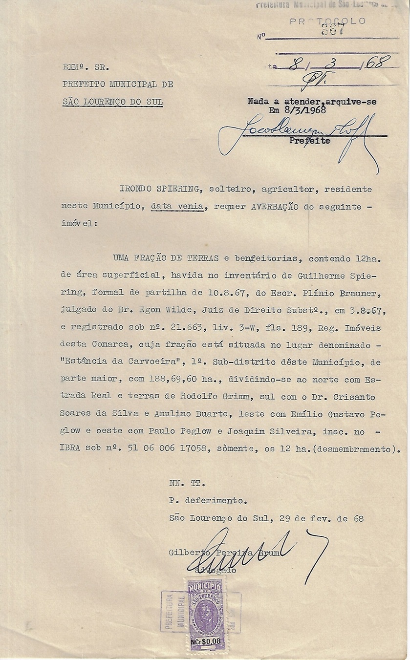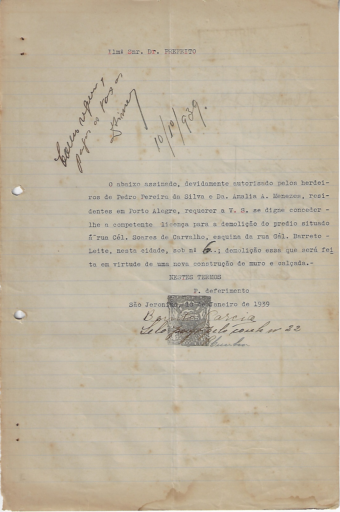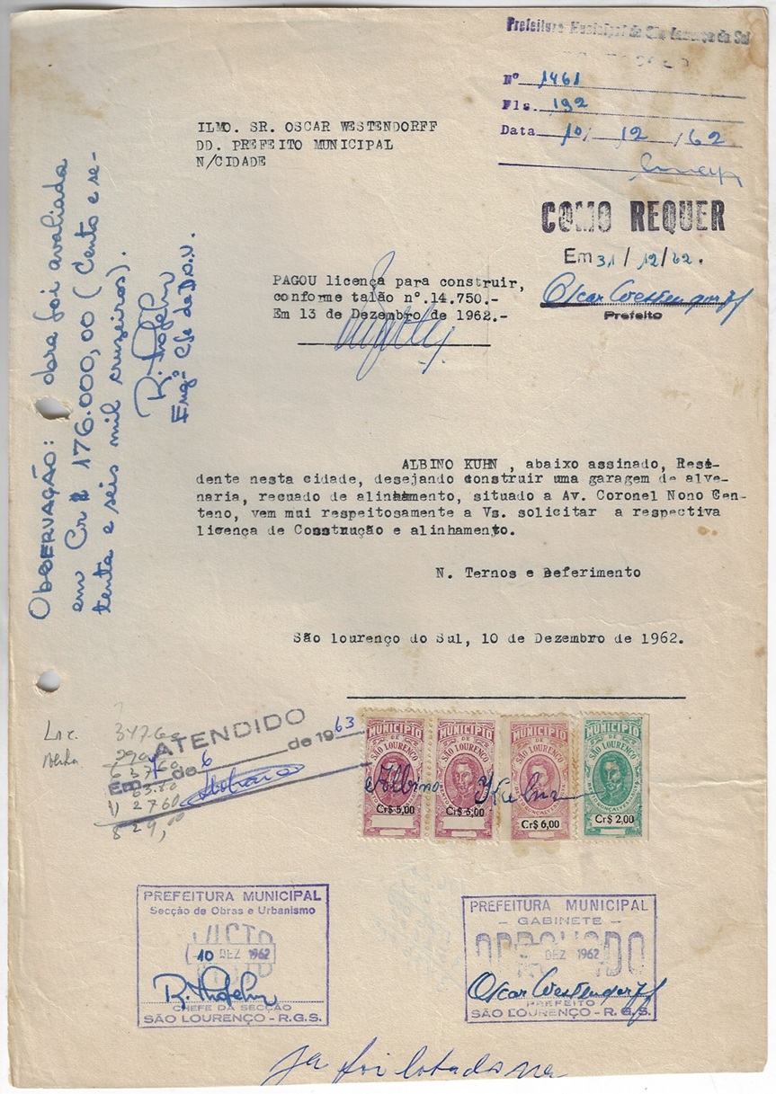 | 917 | Brasil, 1959, solicitação de certidão com selo fiscal do Município de São Jerônimo/RS de Cr$4 | 12,00 | Foto |