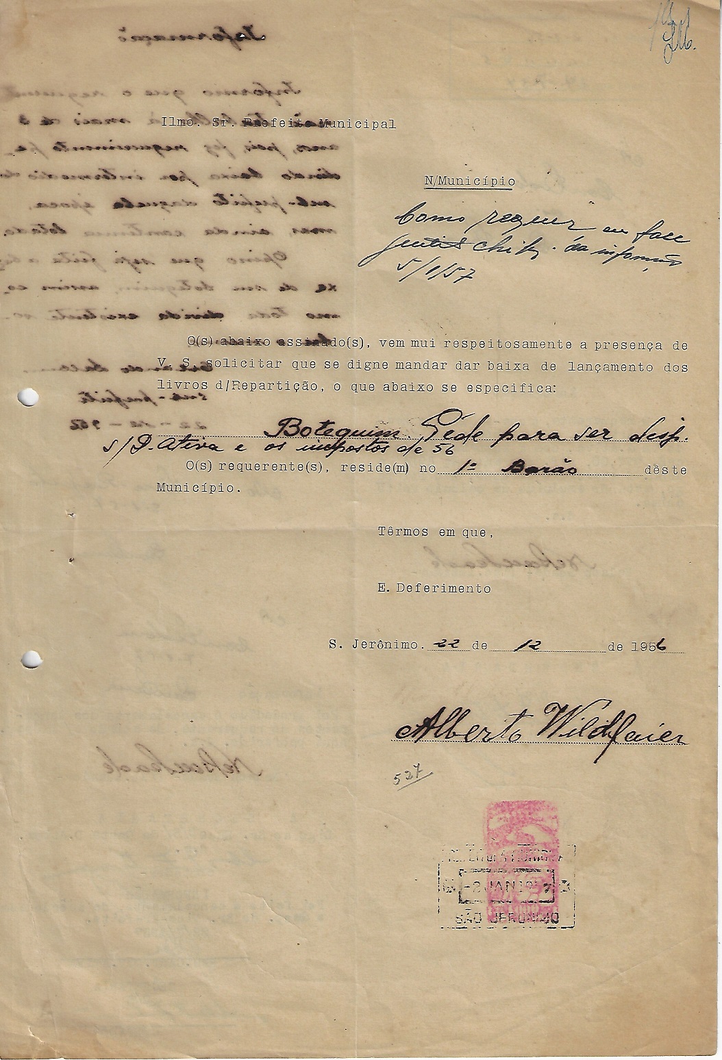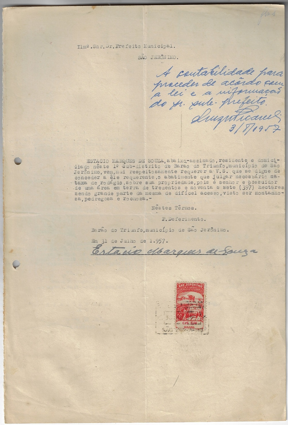 | 49475 | Brasil, 1956, Requerimento com carimbo fiscal do município de São Jerônimo / RS na cor vermelha de Cr$1.000 | 12,00 | Foto |