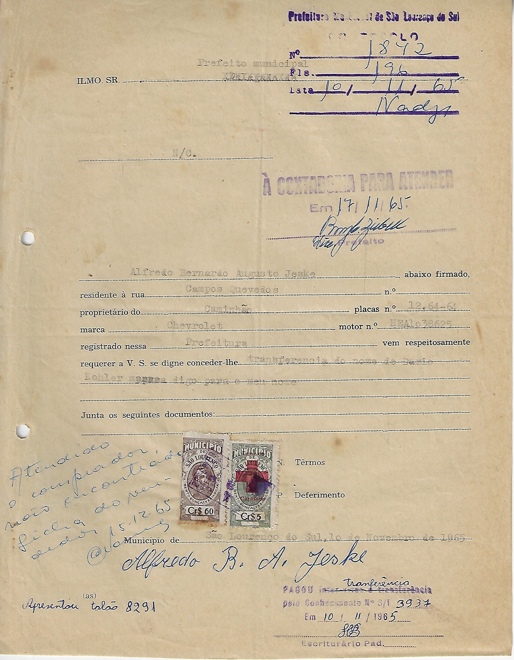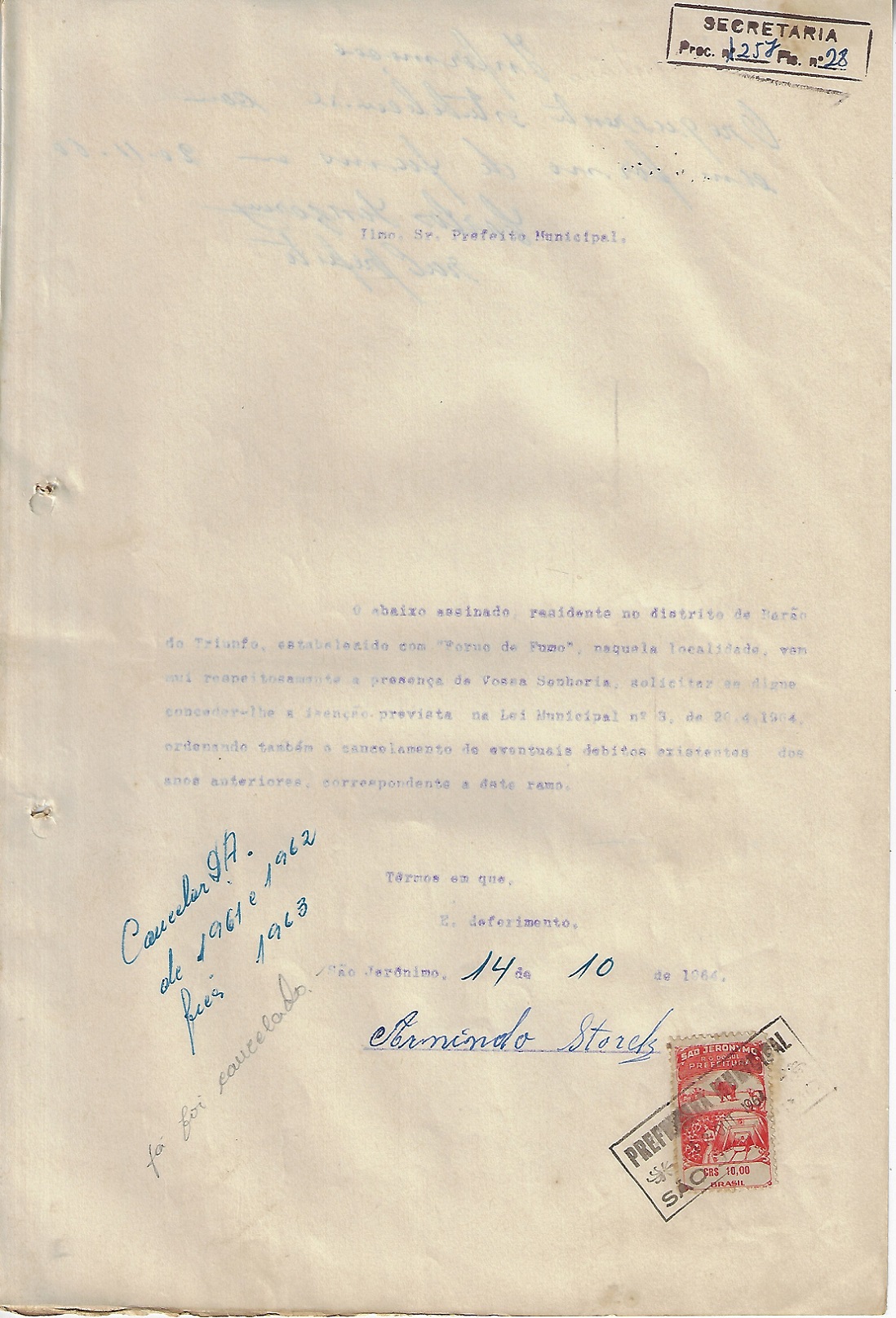 | 919 | Brasil, 1964, requerimento com selo fiscal do município de São Jerônimo / RS no valor de Cr$10 | 12,00 | Foto |