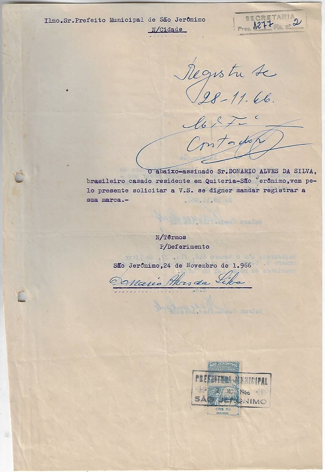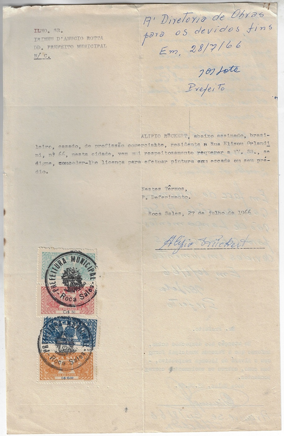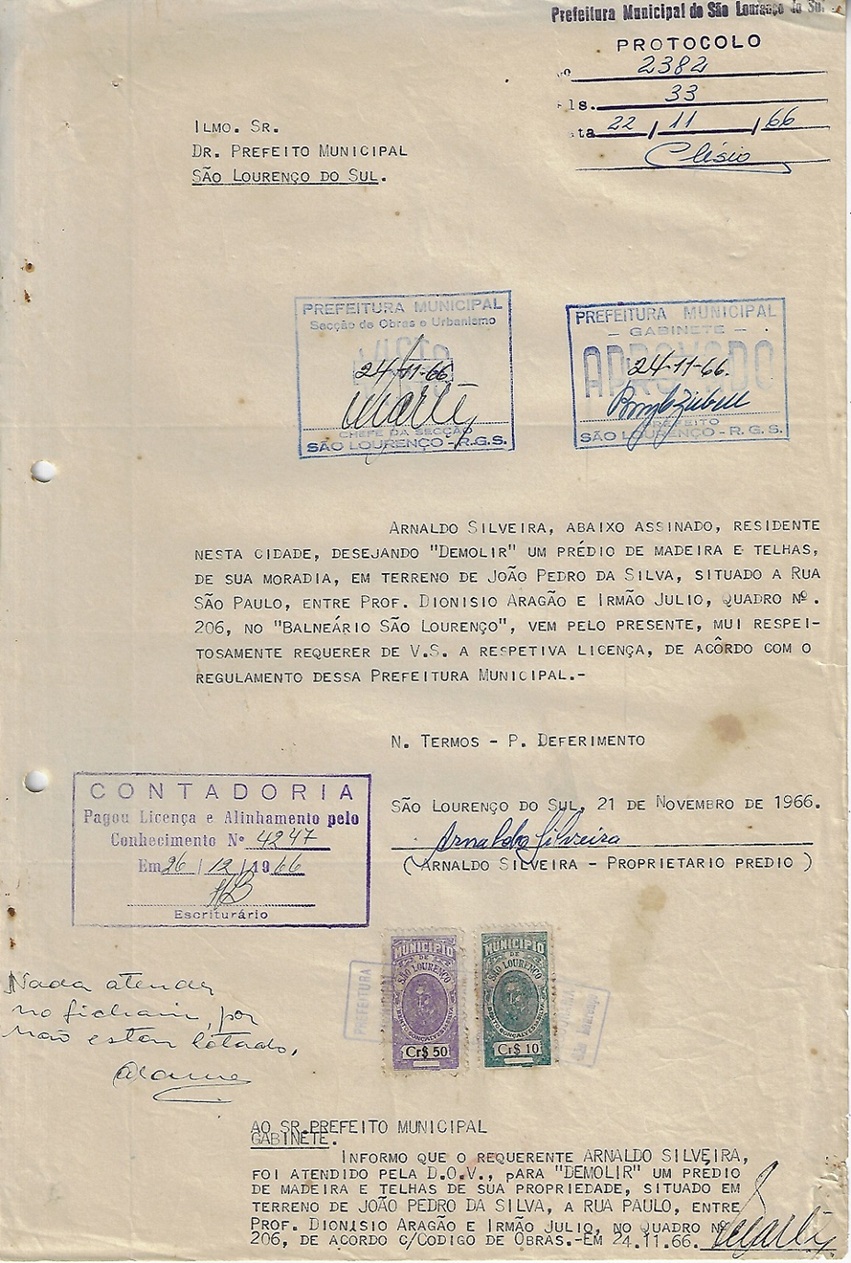 | 920 | Brasil, 1966, requerimento com selo fiscal do município de São Jerônimo/RS de Cr$50 | 12,00 | Foto |