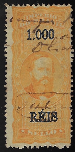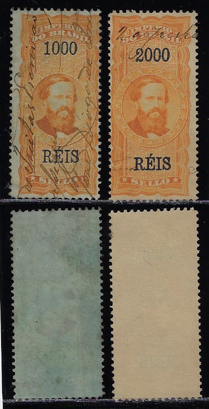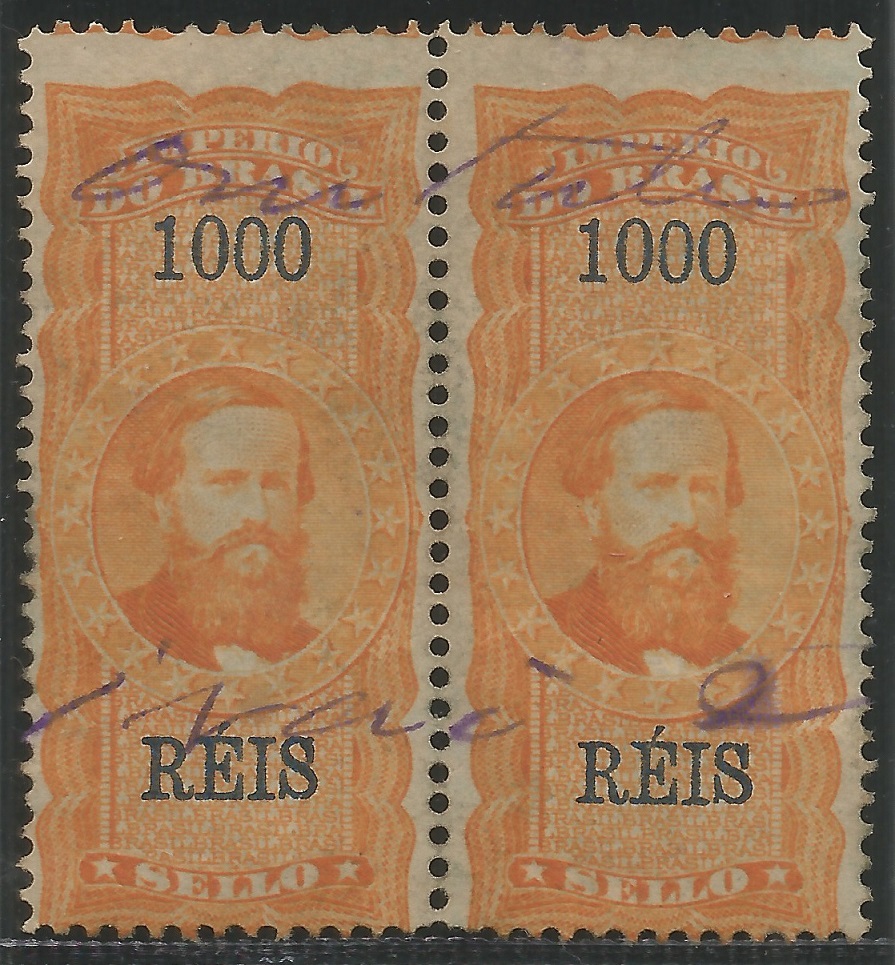 | 82631 | Brasil, 1869, selo fiscal 1$ (par horizontal) e 4$, sem ponto separador de milhar, papel com manchas azuis, obliterado a pena | 32,00 | Foto |