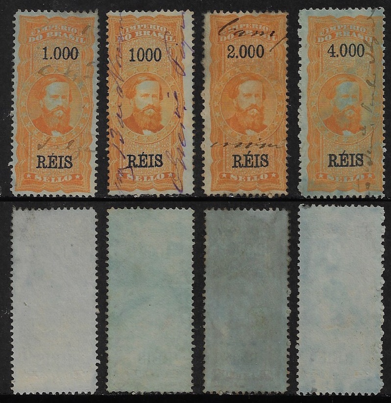 | 75308 | Brasil, 1869, selos fiscais D. Pedro II 200, 400, 600 e 800 Réis, papel com manchas azuis, obliterados a pena | 22,00 | Foto |