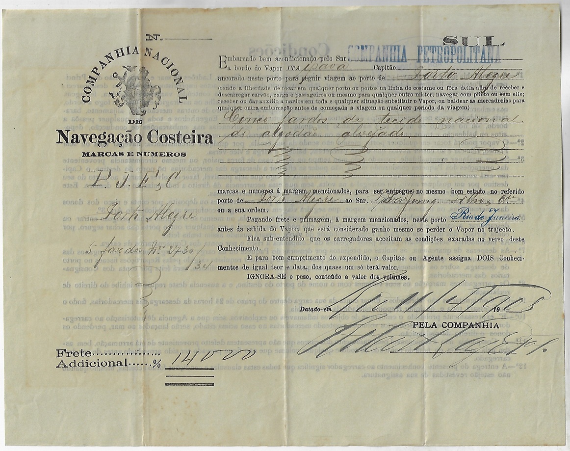 | 15296 | Brasil, 1908, conhecimento de embarque de carga de tecidos de algodão enviada pelo navio a vapor Itaipava, da Companhia Nacional de Navegação Costeira, do Rio de Janeiro (11/4) para Porto Alegre | 20,00 | Foto |