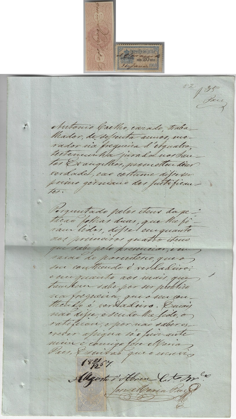 | 21044 | Portugal, 1867, folha de um Processo com selo de 30 Réis na frente, acompanham outros 2 selos fiscais | 20,00 | Foto |