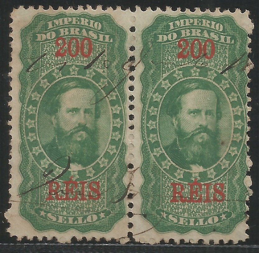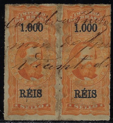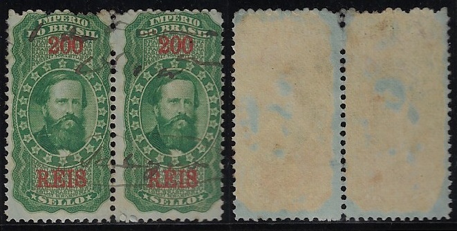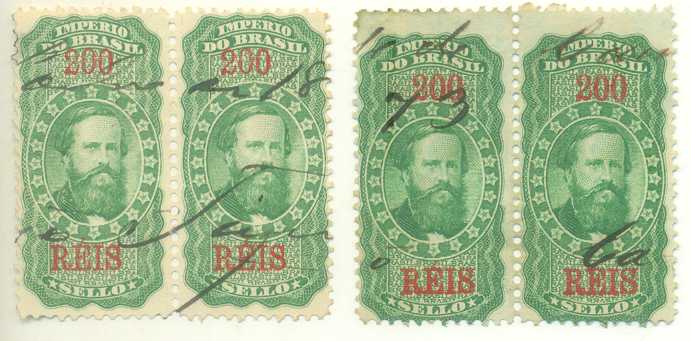 | 75313 | Brasil, 1869, selo fiscal 200 Réis, par horizontal, papel com manchas azuis, obliterados a pena | 10,00 | Foto |