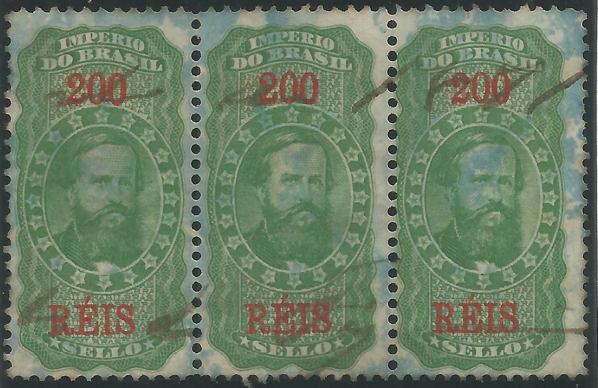 | 21099 | Brasil, 1869, selo fiscal 200 Réis, terno horizontal, papel com manchas azuis, obliterados a pena | 18,00 | Foto |