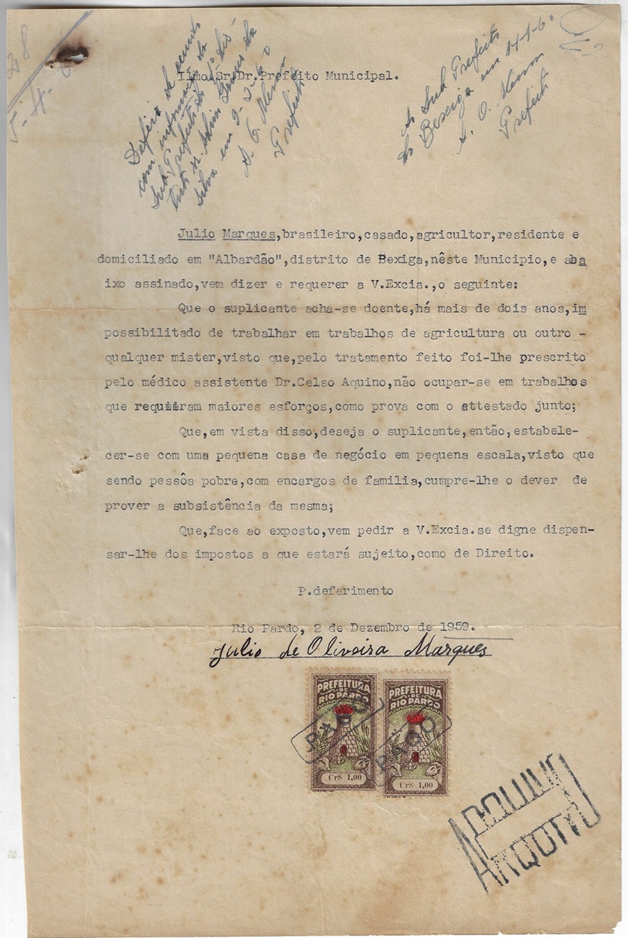 | 24620 | Brasil, 1943, requerimento com 2 selos fiscais do Município de Taquari / RS, 1$, Taxa de Caridade 200 Réis, e 1 selo do Tesouro Nacional 200 Réis | 15,00 | Foto |