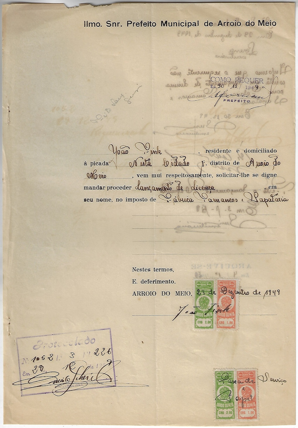 | 24429 | Brasil, 1949, requerimento com 4 selos fiscais do Município de Arroio do Meio / RS, nos valores faciais Cr$1 e Cr$2 | 30,00 | Foto |