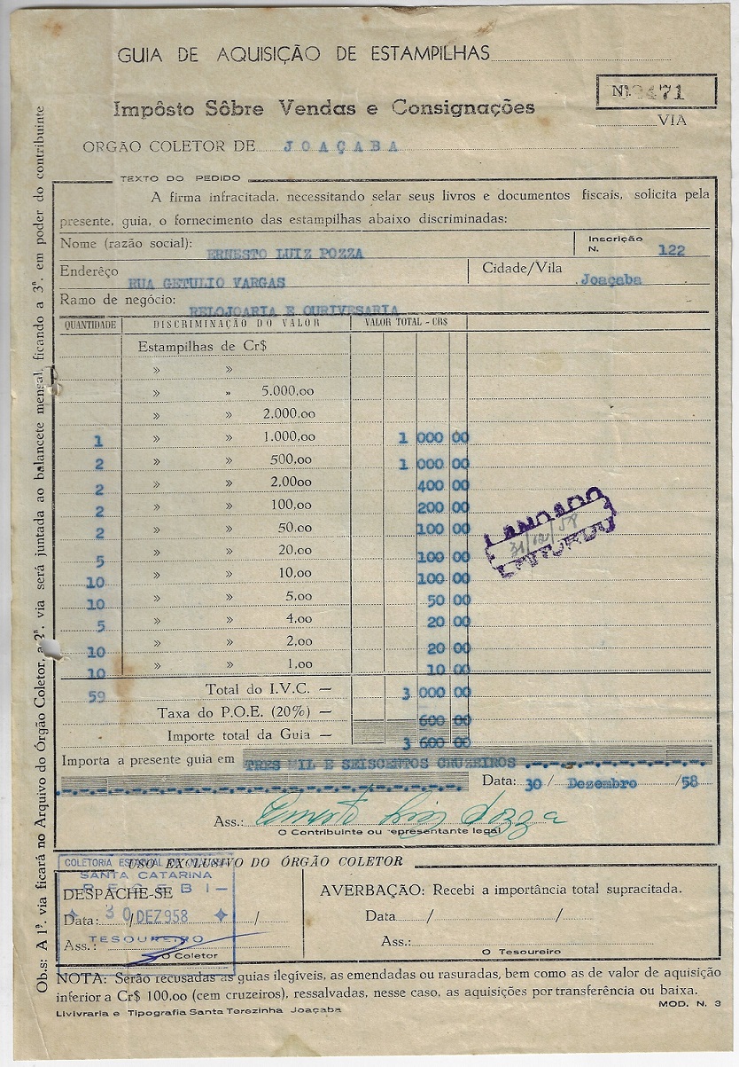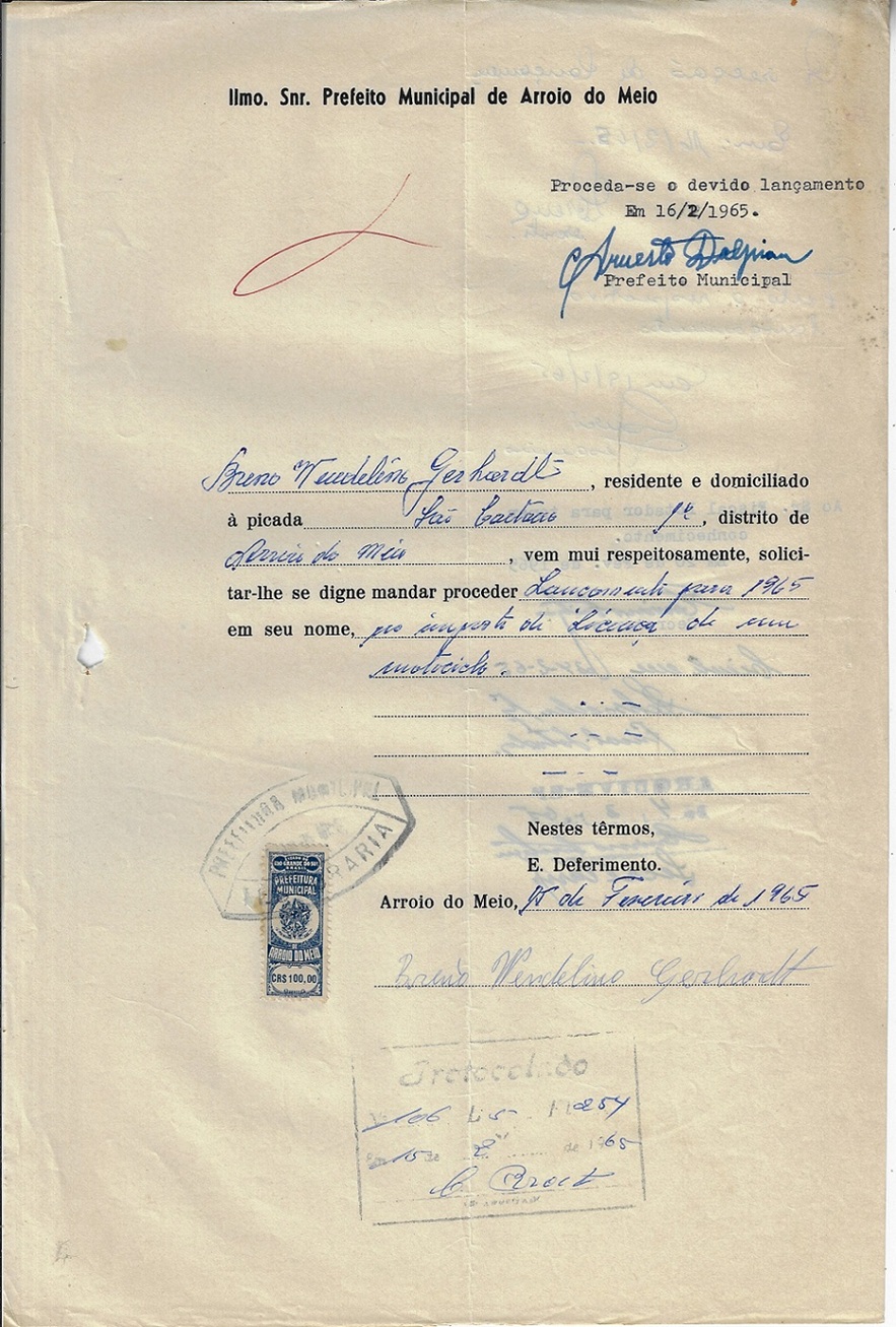 | 24458 | Brasil, 1965, pedido de lançamento com selo fiscal do Município de Arroio do Meio / RS, Cr$100 | 12,00 | Foto |