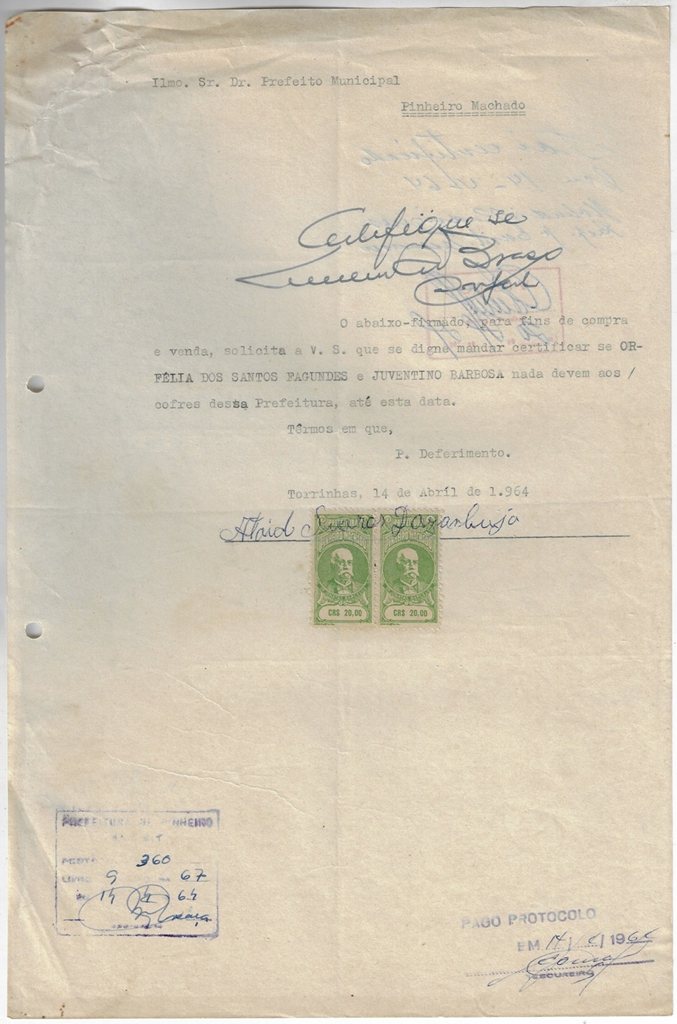 | 24461 | Brasil, 1964, requerimento com 2 selos fiscais do Município de Pinheiro Machado / RS, Cr$20, Dr. Jonatas Barcelos | 15,00 | Foto |