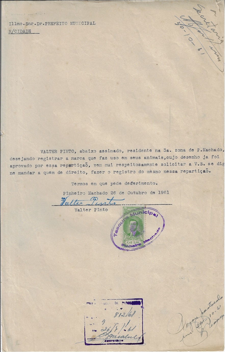 | 24462 | Brasil, 1961, requerimento com selo fiscal do Município de Pinheiro Machado / RS, Cr$5 | 12,00 | Foto |