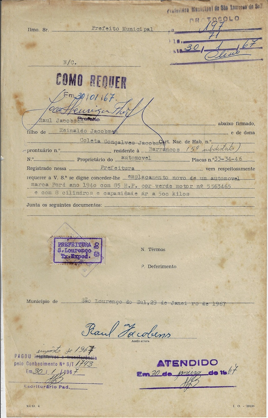 | 24465 | Brasil, 1967, requerimento com selo fiscal do Município de São Lourenço / RS, Cr$80 | 12,00 | Foto |