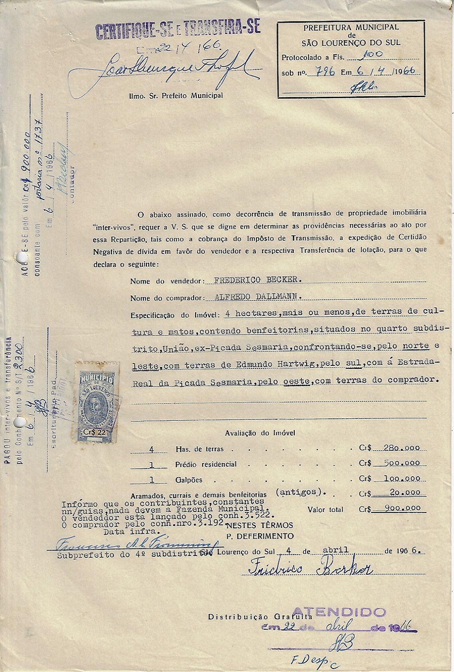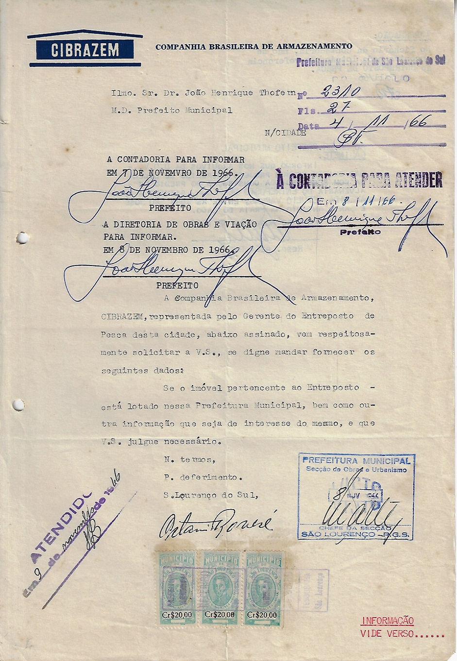 | 24469 | Brasil, 1966, requerimento com 3 selos fiscais do Município de São Lourenço / RS, Cr$20 | 25,00 | Foto |