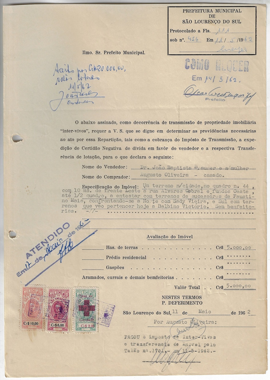| 24471 | Brasil, 1962, requerimento com 4 selos fiscais do Município de São Lourenço / RS, Cr$2, Cr$5(2) e Cr$6 | 30,00 | Foto |