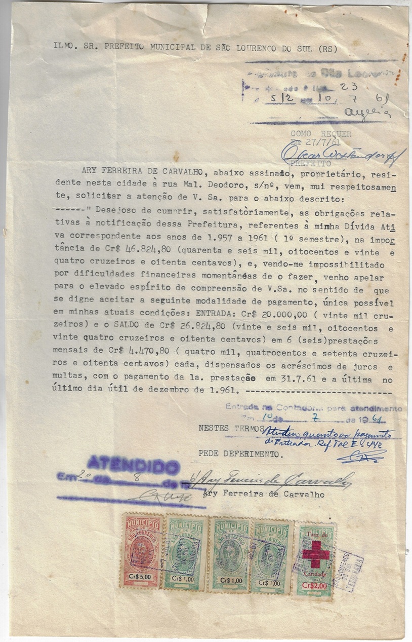 | 24472 | Brasil, 1961, requerimento com 5 selos fiscais do Município de São Lourenço / RS, Cr$1(3), Cr$5 e Taxa de Caridade Cr$2 | 48,00 | Foto |