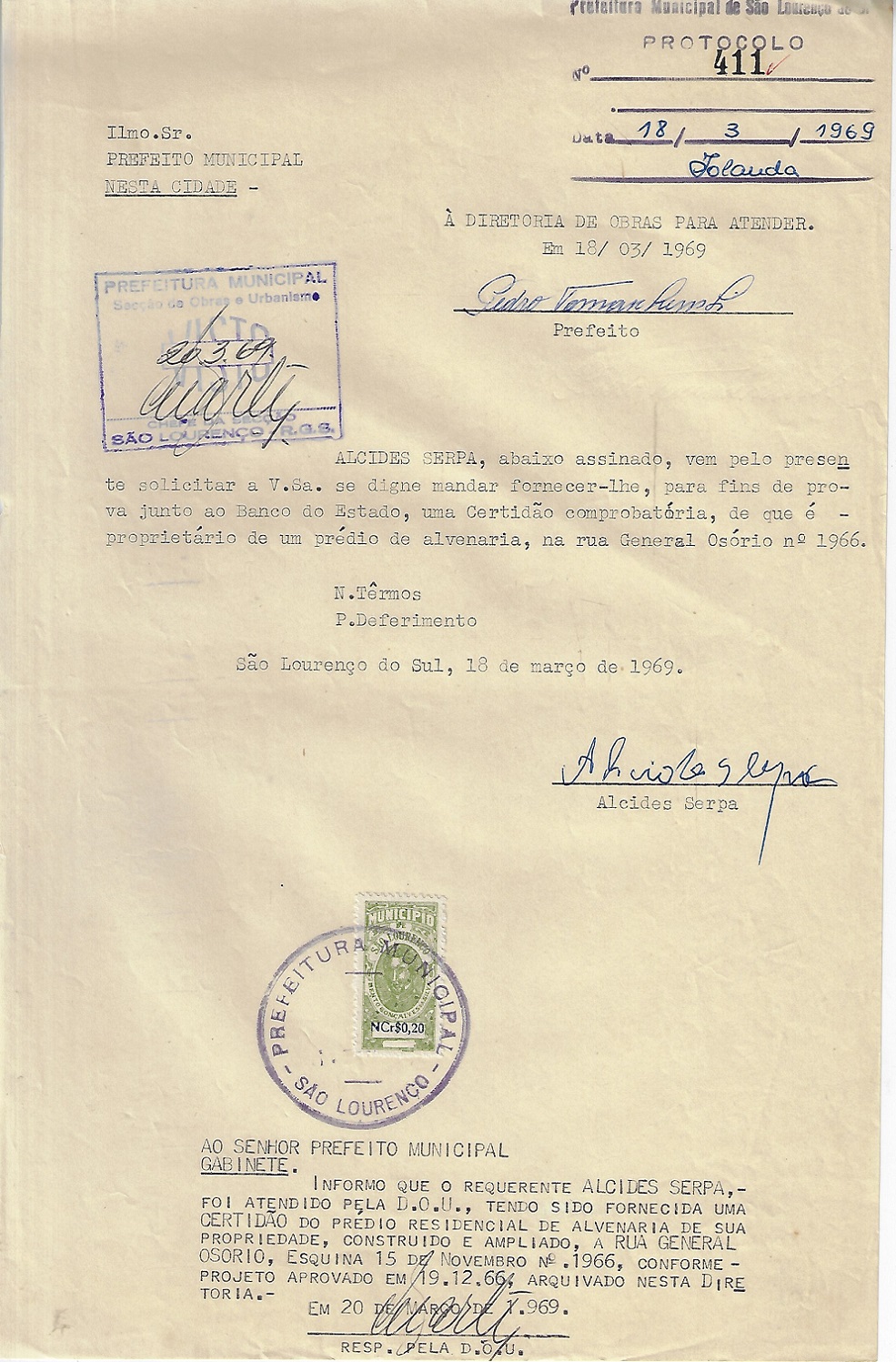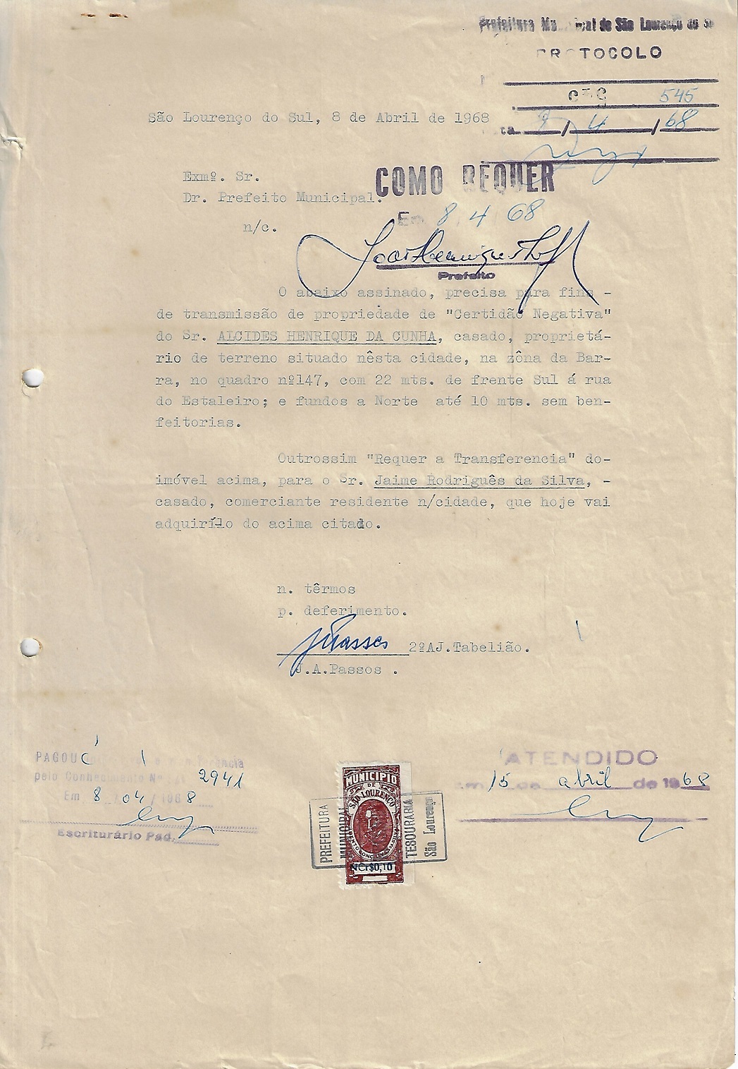| 24475 | Brasil, 1968, requerimento com selo fiscal do Município de São Lourenço / RS, NCr$0,10 | 12,00 | Foto |