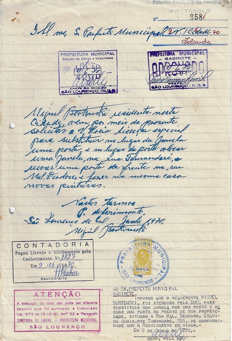 | 24474 | Brasil, 1970, requerimento com selo fiscal do Município de São Lourenço / RS, NCr$0,20 (amarelo) | 12,00 | Foto |