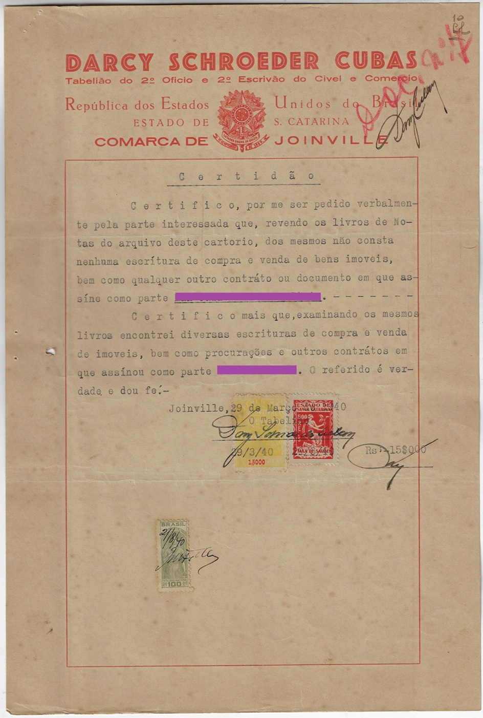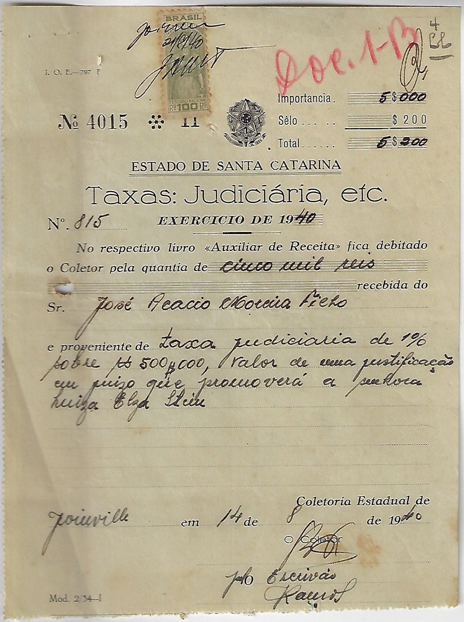 | 24477 | Brasil, 1940, documento da Coletoria Estadual de Santa Catarina, expedido em Joinville, com selo fiscal do Tesouro Nacional, Selo Penitenciário 100 Réis | 10,00 | Foto |