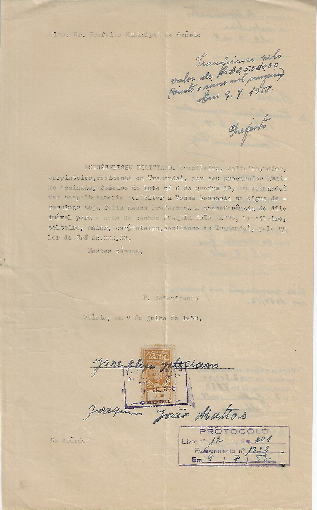 | 24483 | Brasil, 1958, requerimento com selo fiscal do Município de Osório / RS, Cr$10 | 12,00 | Foto |