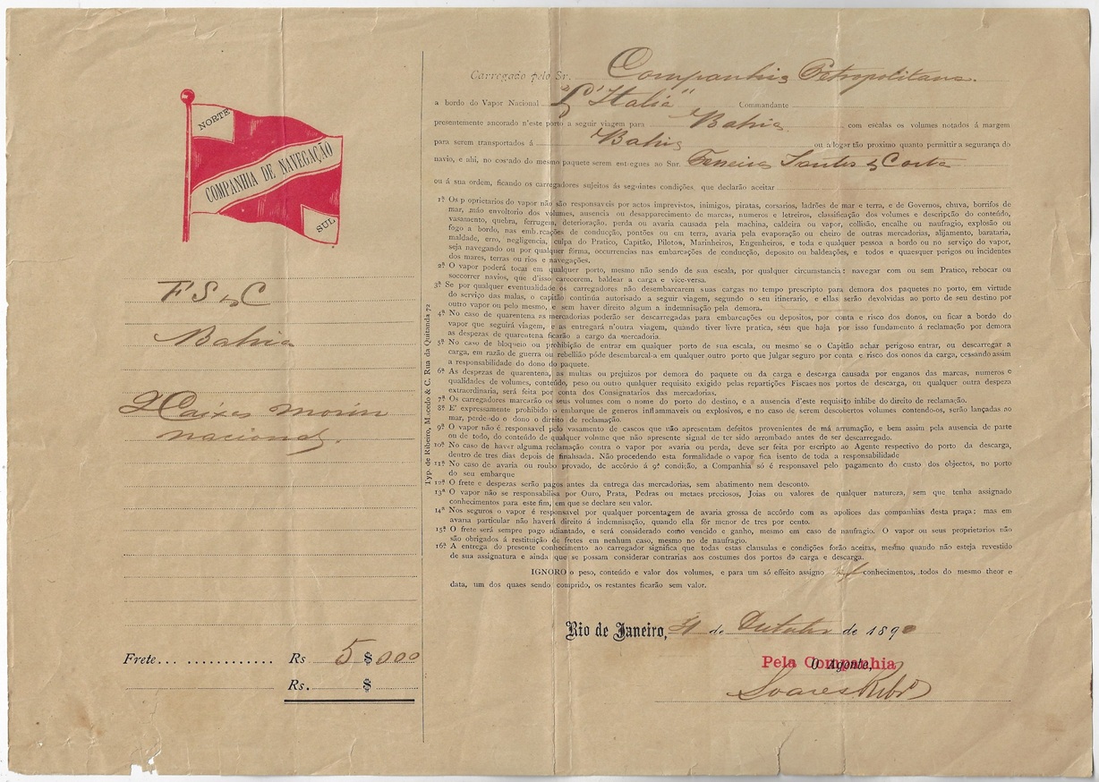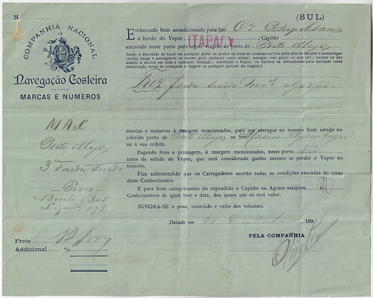 | 1668 | Brasil, 1899, conhecimento de embarque de carga de tecidos de algodão enviada pelo navio a vapor Itapacy, da Companhia Nacional de Navegação Costeira, do Rio de Janeiro (20/10) para Porto Alegre | 20,00 | Foto |