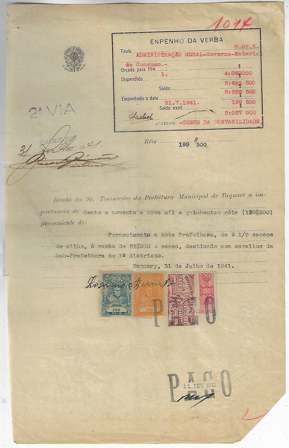 | 24621 | Brasil, 1941, recibo com 3 selos fiscais do Município de Taquari / RS, 200 e 400 Réis, Taxa de Caridade 200 Réis, e 1 do Tesouro Nacional 200 Réis | 25,00 | Foto |