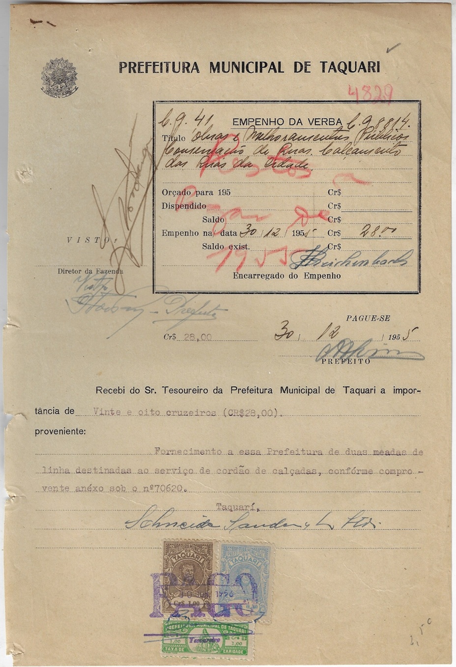 | 24622 | Brasil, 1955, recibo com 3 selos fiscais do Município de Taquari / RS, Cr$0,50 e 1, Taxa de Caridade, Cr$1 | 25,00 | Foto |