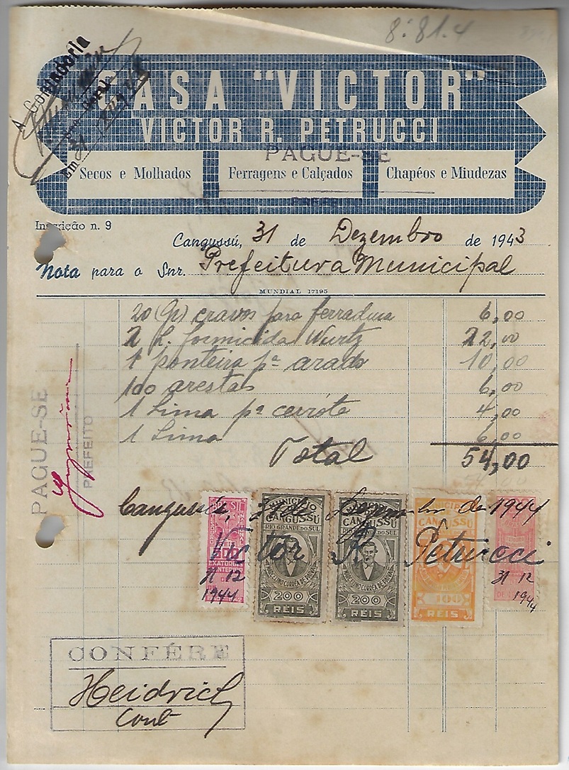 | 24629 | Brasil, 1944, nota fiscal da Casa Victor, de Victor Petrucci, com 3 selos fiscais do Município de Canguçu / RS, 100 e 200 (par) Réis, e 2 selos do Tesouro Nacional 200 e 500 Réis | 25,00 | Foto |