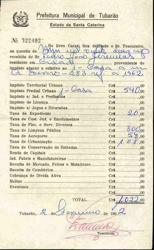 | 35319 | Brasil, 1958/1962, 3 documentos impressos da Prefeitura de Tubarão referentes a Imposto Predial Urbana, todos diferentes, não selados | 5,00 | Foto |