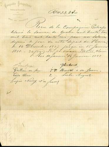| 36003 | Brasil, 1888, Recibo da Companhia Petropolitana, selo fiscal 200 Réis (Cifra Cheia) | 15,00 | Foto |