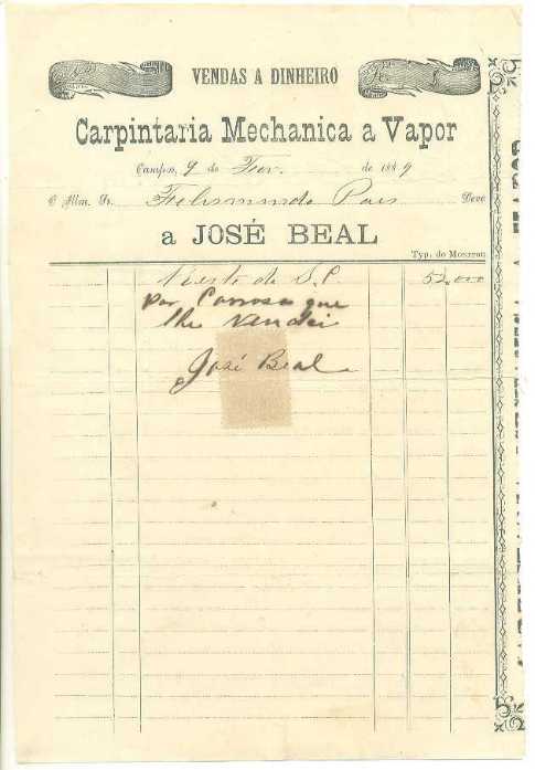 | 46107 | Brasil, 1889, Nota Fiscal da Carpintaria Mecânica a vapor, de Joel Beal, emitida em Campos dos Goytacazes, selo fiscal Cifra Cheia 200 Réis | 15,00 | Foto |