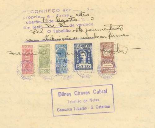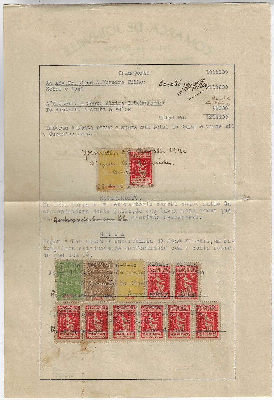 | 82015 | Brasil, 1940, documento emitido em Joinville com selos fiscais do Estado de Santa Catarina, 1.000 Réis e Taxa de Saúde 500 Réis e do Tesouro Nacional Selo Penitenciário 100 Réis | 10,00 | Foto |