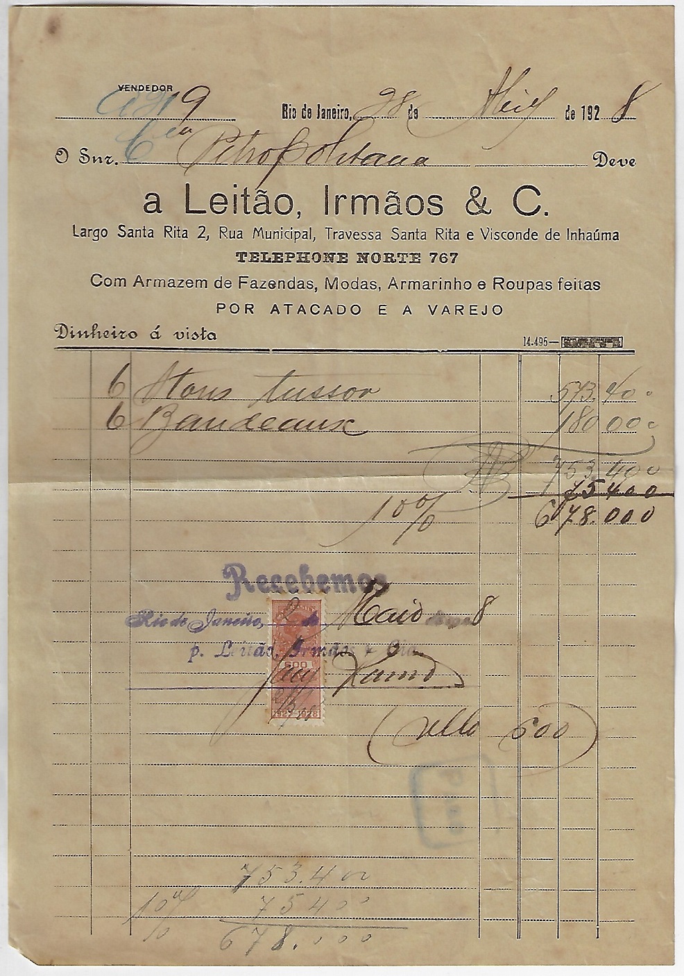 | 46123 | Brasil, 1928, nota fiscal da Leitão, Irmãos & C, emitida no Rio de Janeiro, selo fiscal 600 Réis do Tesouro Nacional | 10,00 | Foto |