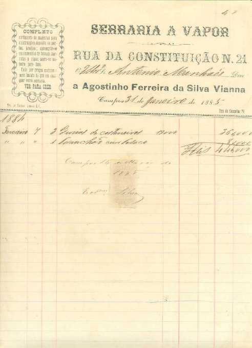 | 46133 | Brasil, 1885, Nota Fiscal da Serraria a Vapor, de Agostinho Ferreira da Silva Vianna, em Campos dos Goytacazes, selo fiscal D. Pedro II 200 Réis | 15,00 | Foto |