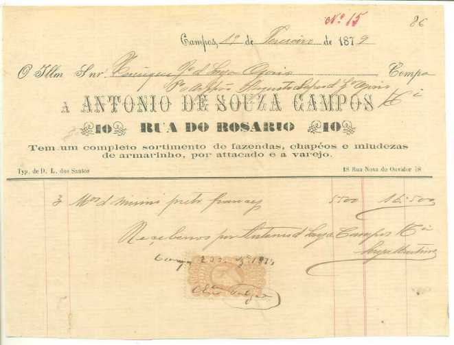 | 46157 | Brasil, 1879, Nota Fiscal da Loja de Antônio de Souza Campos, em Campos dos Goytacazes, selo fiscal D. Pedro II 200 Réis | 15,00 | Foto |