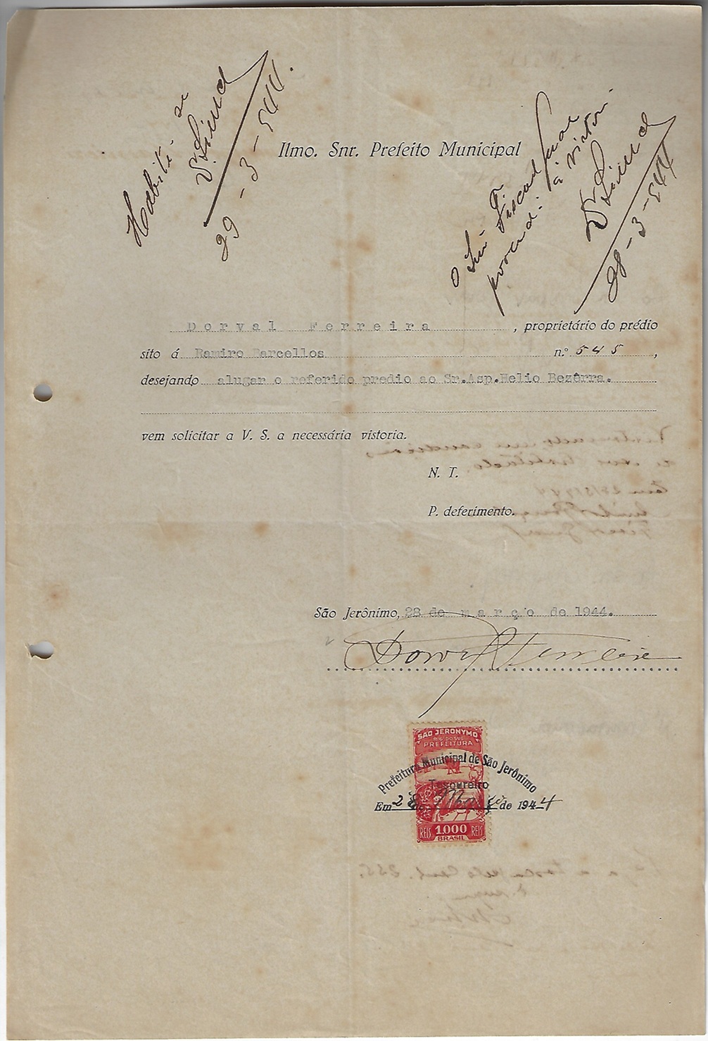 | 49473 | Brasil, 1944, Requerimento com selo fiscal do município de São Jerônimo / RS na cor vermelha de 1.000 Réis | 12,00 | Foto |