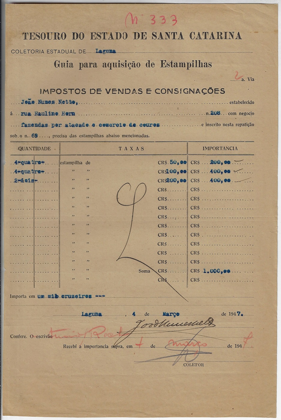 | 51463 | Brasil, 1947, Guia para Aquisição de Estampilhas, Imposto de Vendas e Consignações, Tesouro do Estado de Santa Catarina | 20,00 | Foto |