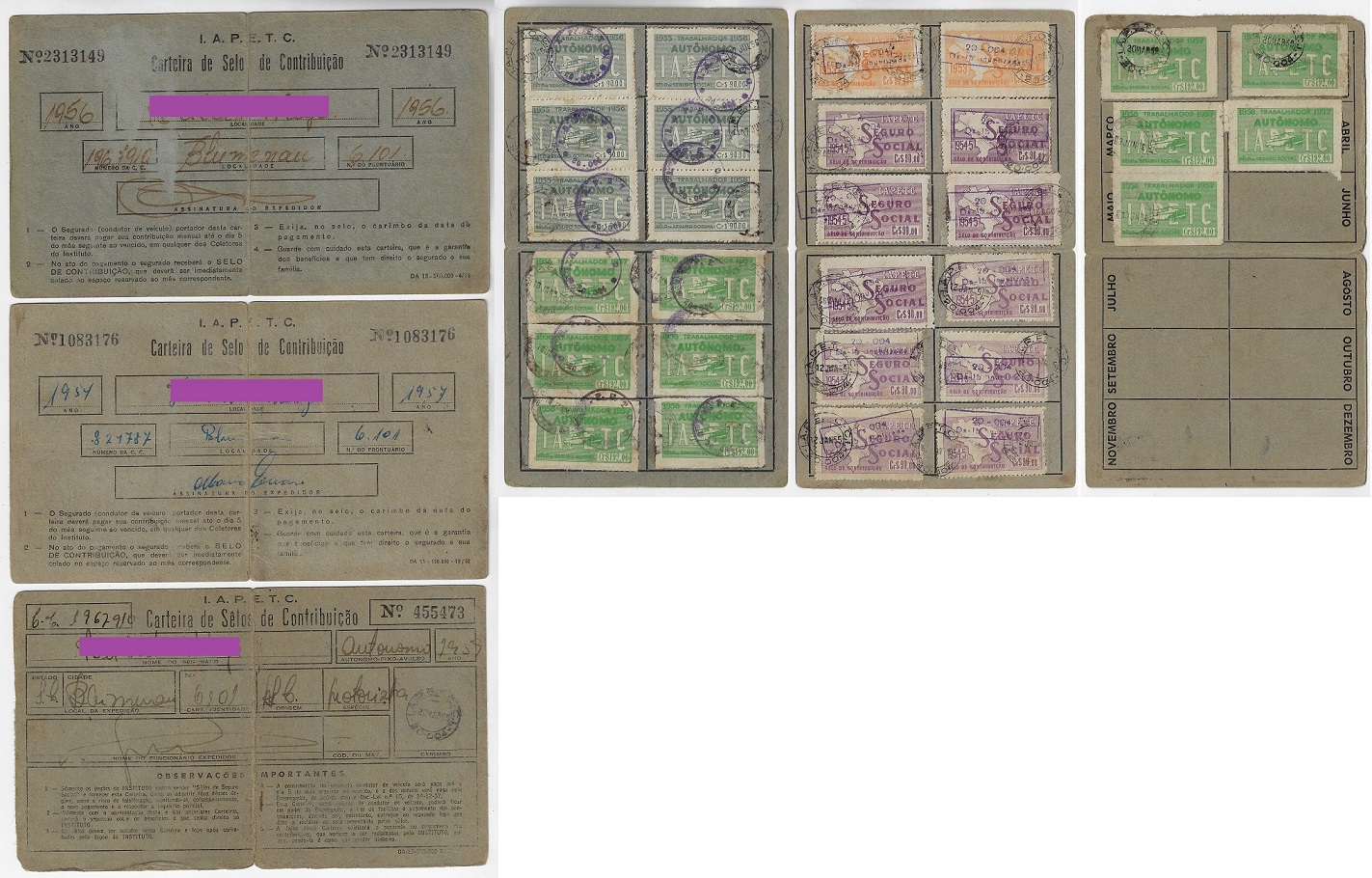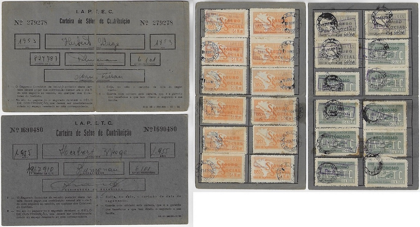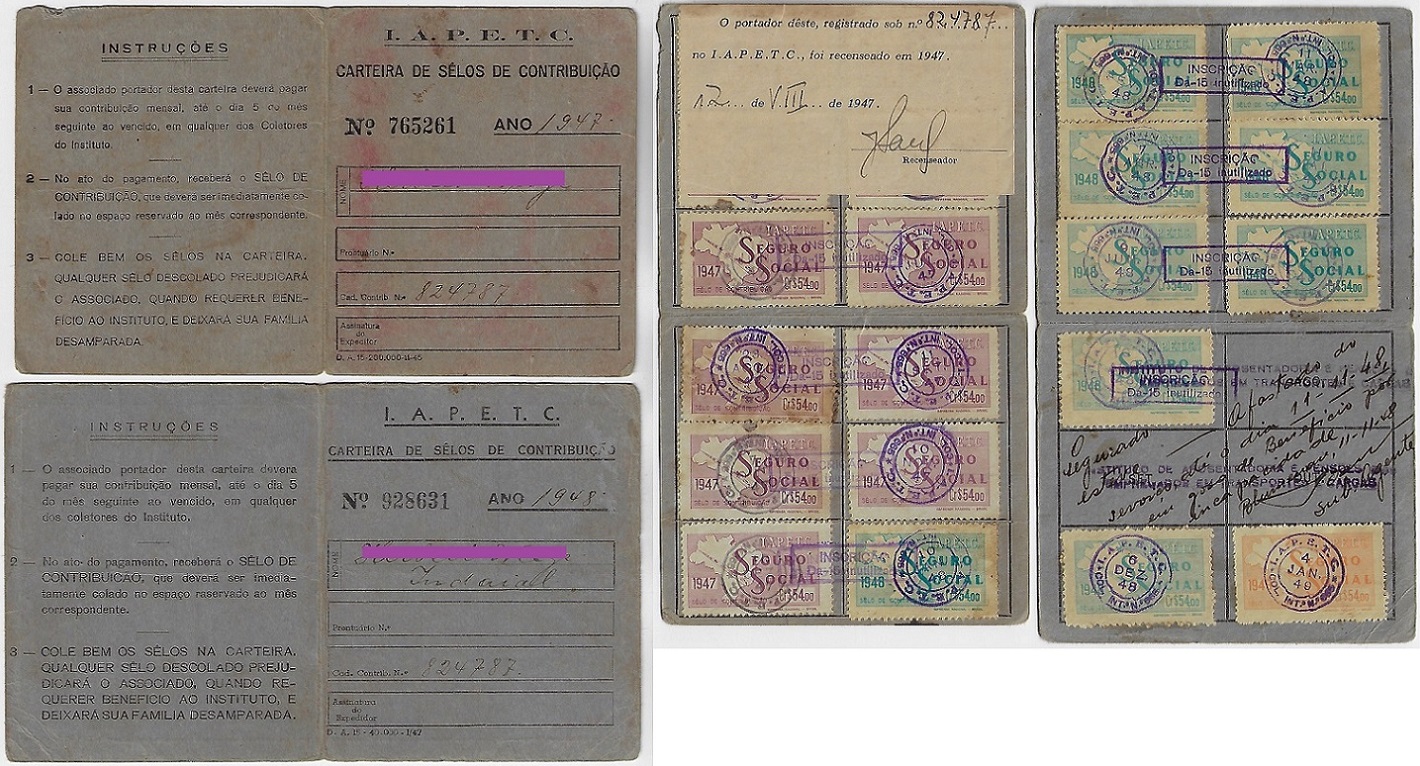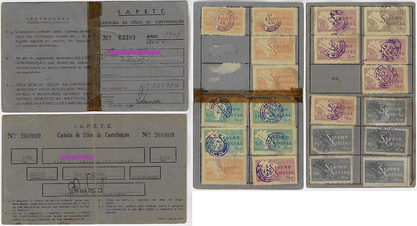 | 59004 | Brasil, 1951, Carteira de Contribuição do IAPETC completa com 12 selos: Cr$82,50 cinza (8), Cr$82,50 vermelho (3) e Cr$67,50 (1) + 1952, Carteira com 8 selos: Cr$82,50 (3) e R$90 (5) | 80,00 | Foto |