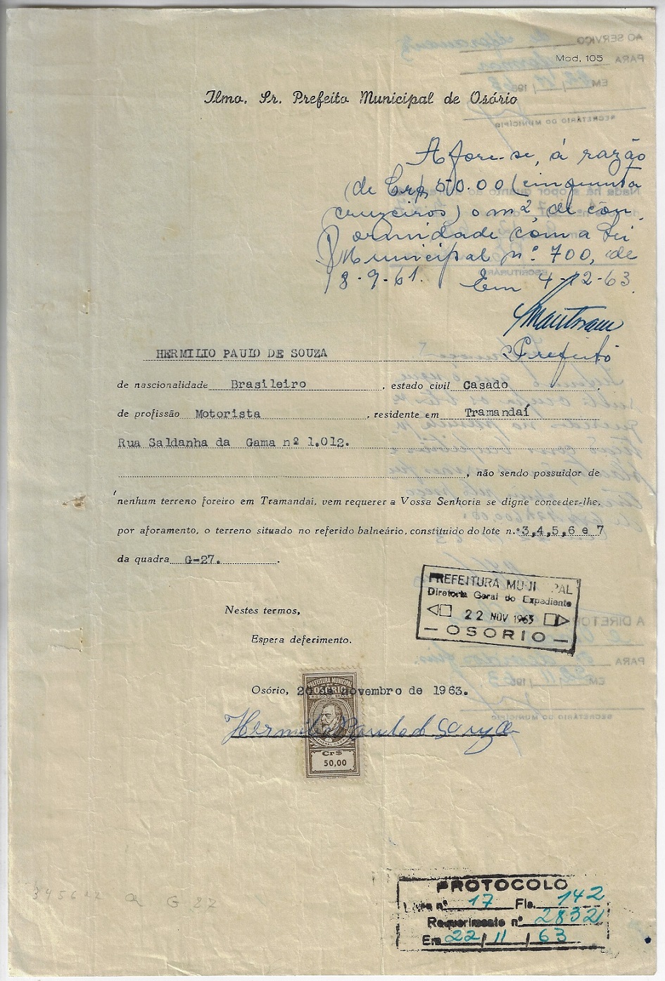 | 62037 | Brasil, 1963, requerimento com selo fiscal do Município de Osório / RS de Cr$50 General Osório | 12,00 | Foto |