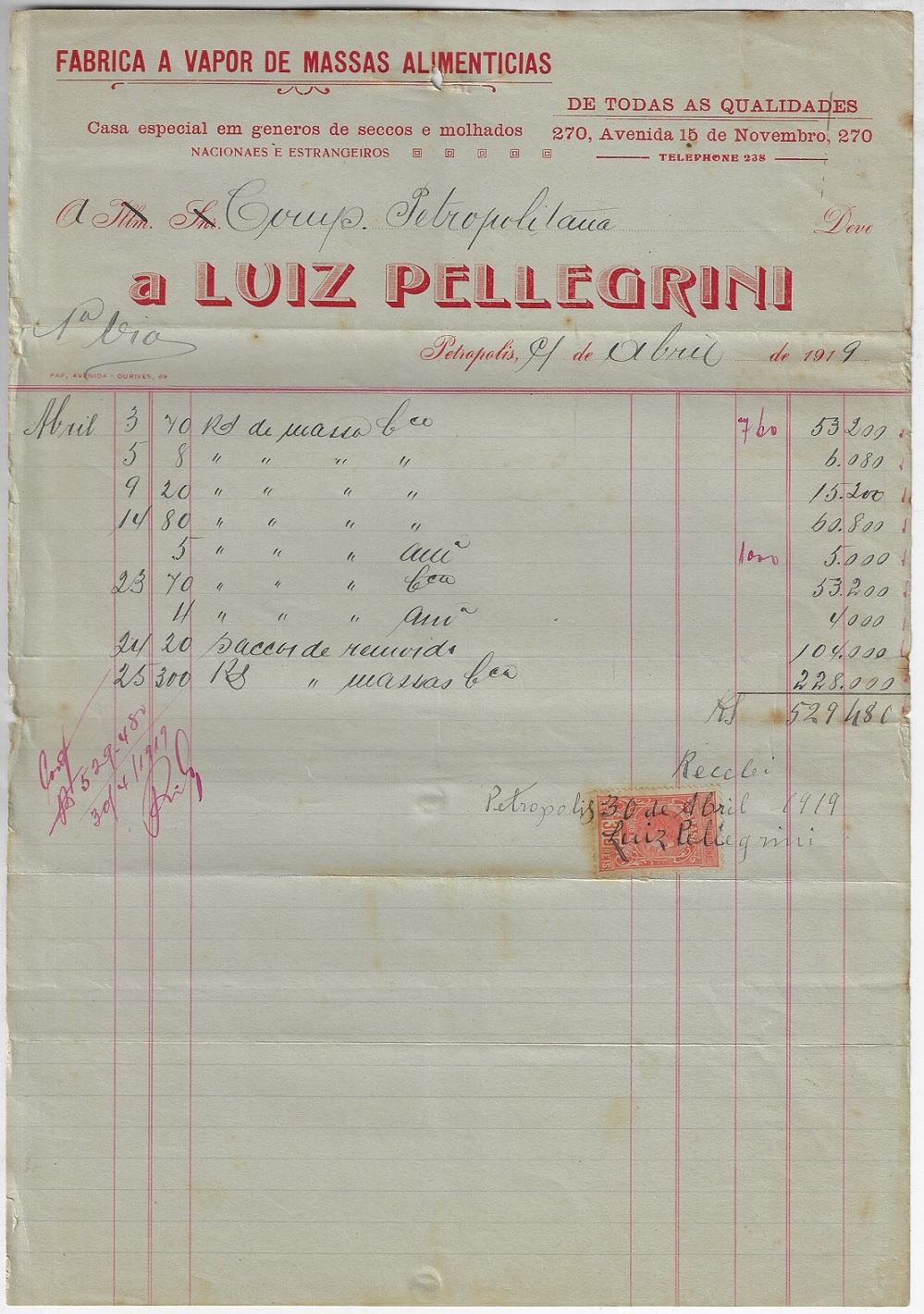 | 65405 | Brasil, 1919, nota fiscal de Luiz Pellegrini, massas alimentícias, de Petrópolis, selo fiscal do Tesouro Nacional 300 Réis | 10,00 | Foto |