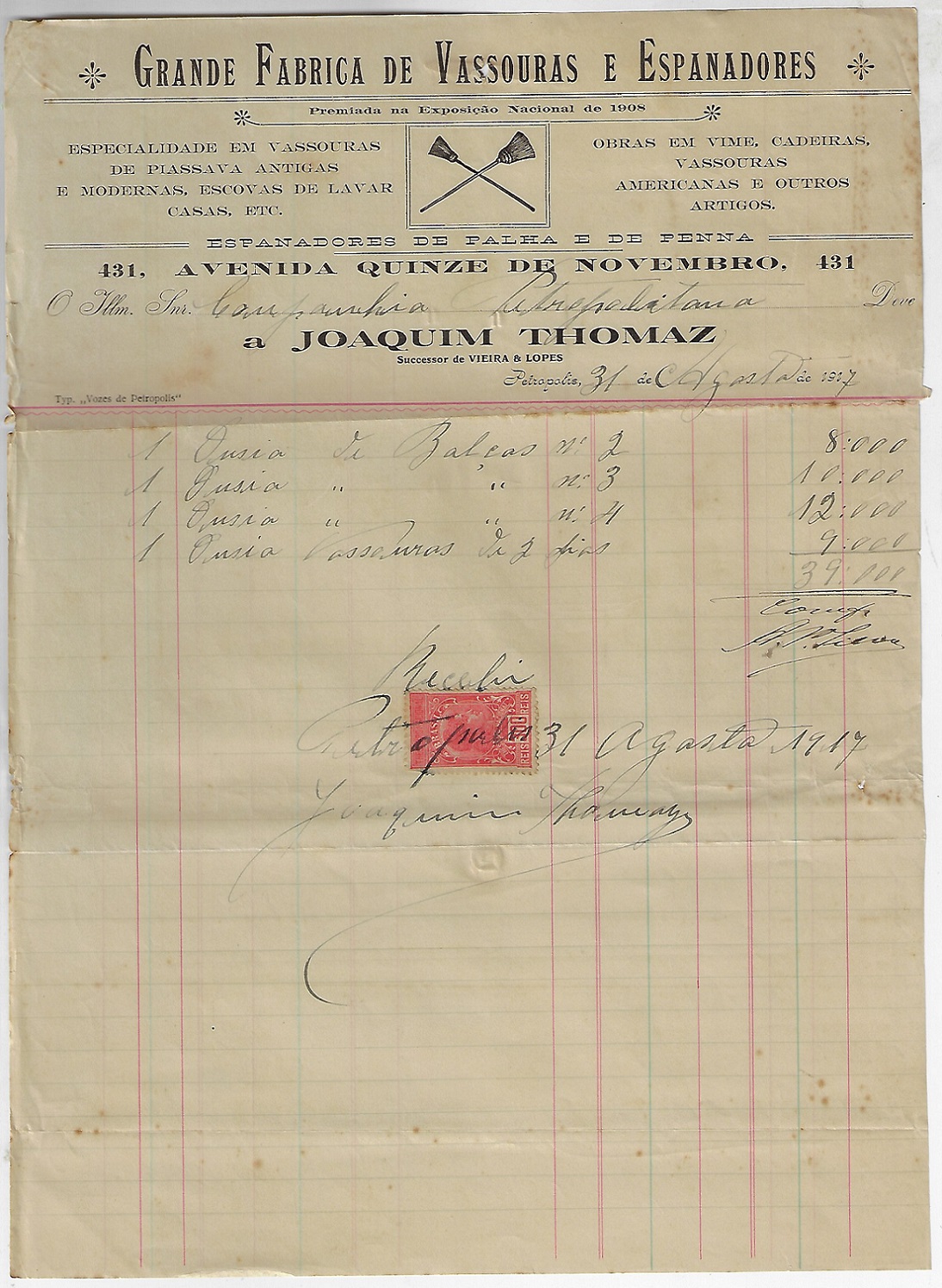 | 65415 | Brasil, 1917, nota fiscal da Grande Fábrica de Vassouras e Espanadores, de Petrópolis, selo fiscal do Tesouro Nacional 300 Réis | 10,00 | Foto |