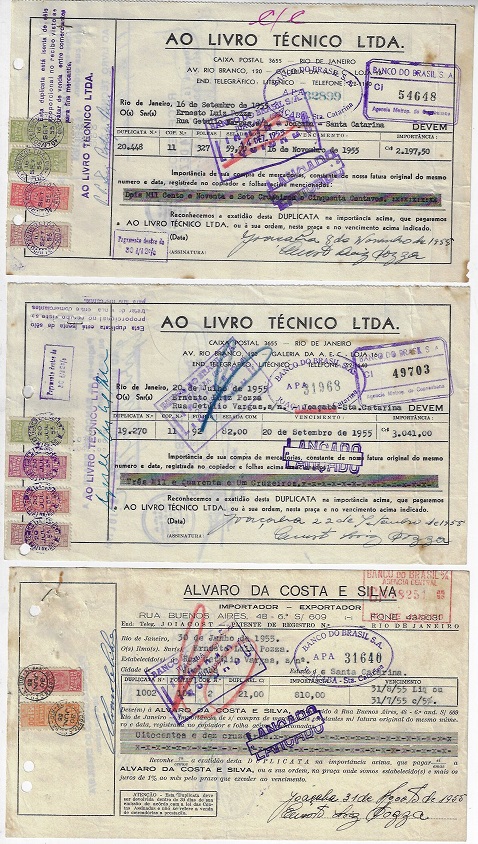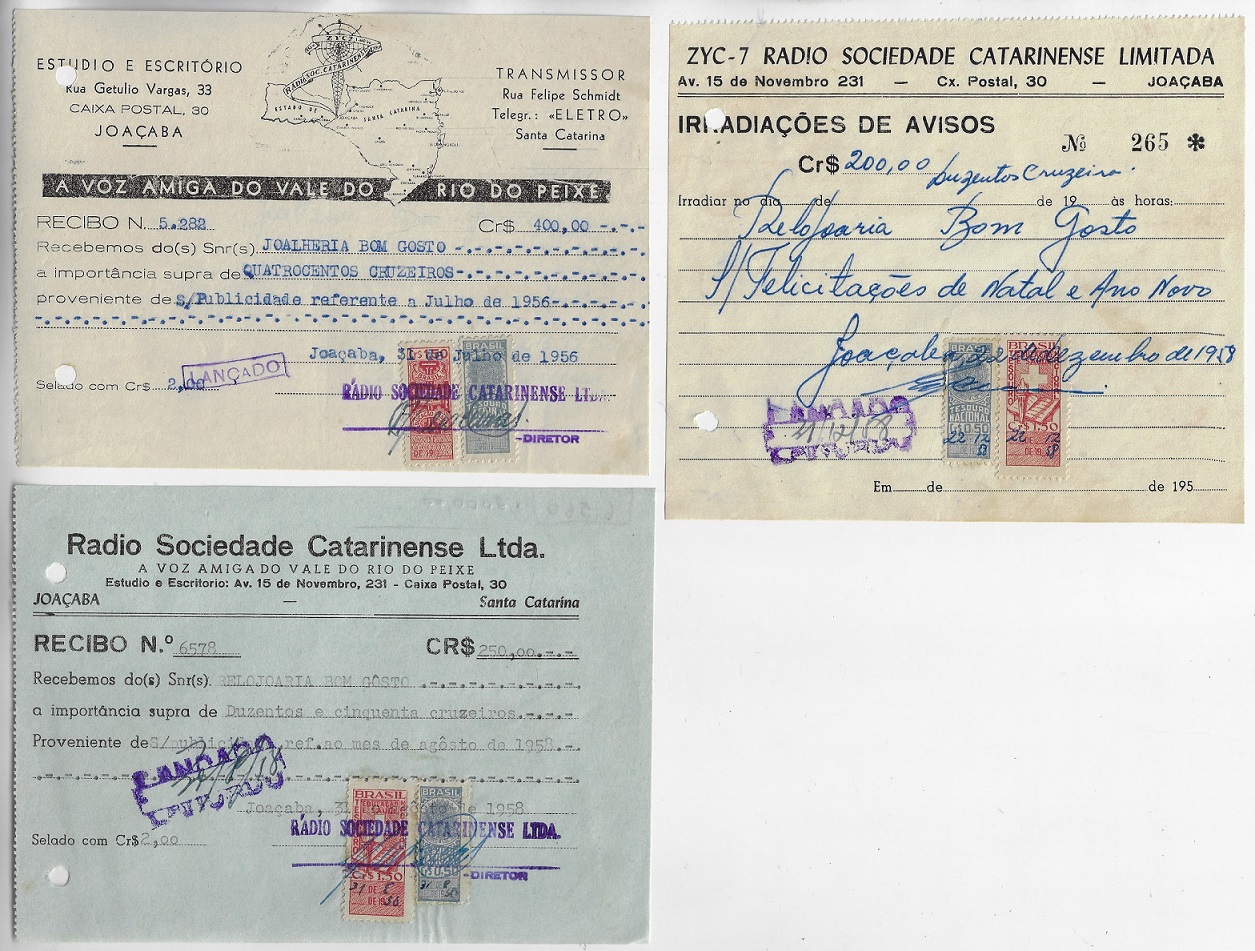 | 65755 | Brasil, 1956/1958, 3 recibos da Rádio Sociedade Catarinense Ltda, de Joaçaba, todos com selos fiscais federais | 15,00 | Foto |