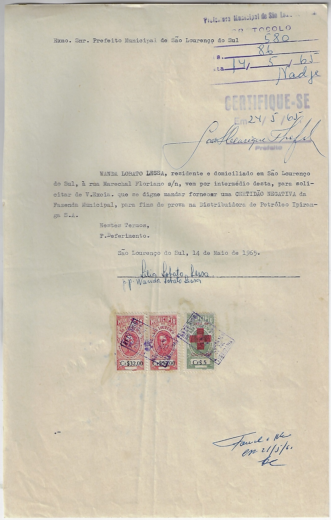 | 24464 | Brasil, 1965, requerimento com 2 selos fiscais do Município de São Lourenço / RS, Cr$60 e Taxa de Caridade Cr$5 | 15,00 | Foto |