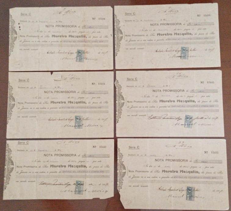 | 73397 | Brasil, 1917, 6 promissórias assinadas na mesma data em Campos no valor de 14$880 Réis cada, cada qual com selo fiscal federal 400 Réis | 60,00 | Foto |