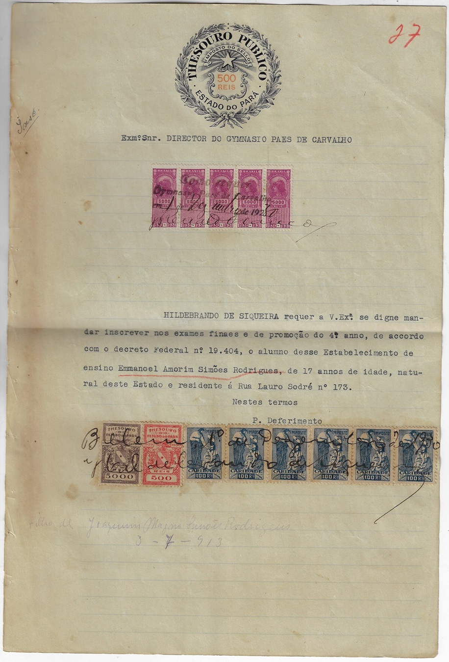| 73975 | Brasil, 1930, inteiro fiscal com selo impresso 500 Réis, selos adicionais nos valores de 100 (6), 500 e 5.000 Réis, todos do Estado do Pará, e 5 selos fiscais federais | 20,00 | Foto |